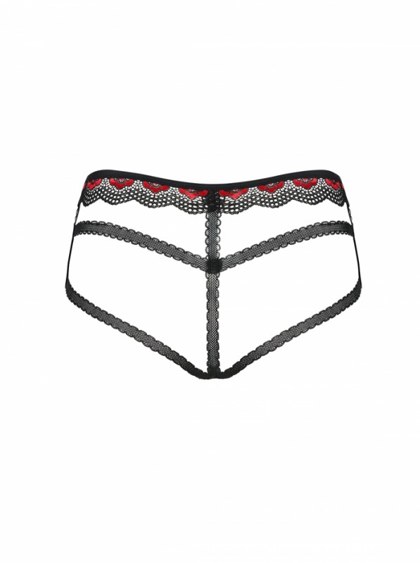 Выполнены в виде шортиков, где ягодицы оголены и эластичные ленты имитируют стрепы! Нежное кружево черно-красного цвета придает образу особенный шарм и подчеркивает Ваш идеальный вкус!